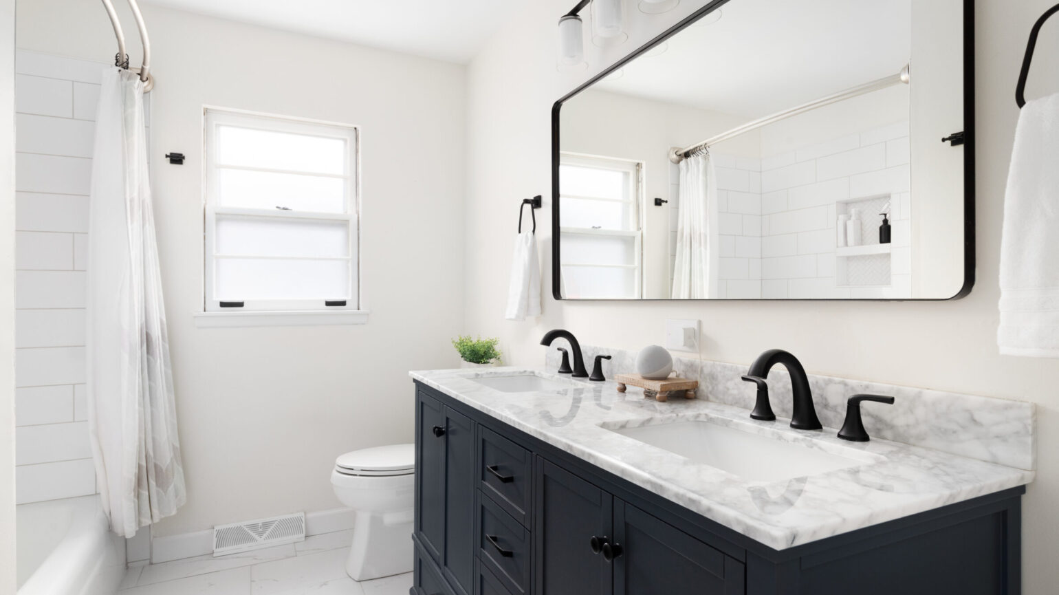 A modern bathroom features a double vanity with marble countertop, large mirror, black fixtures, white walls, and a bathtub with shower curtain.